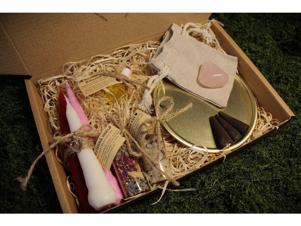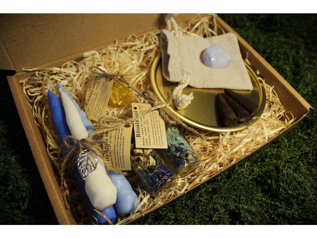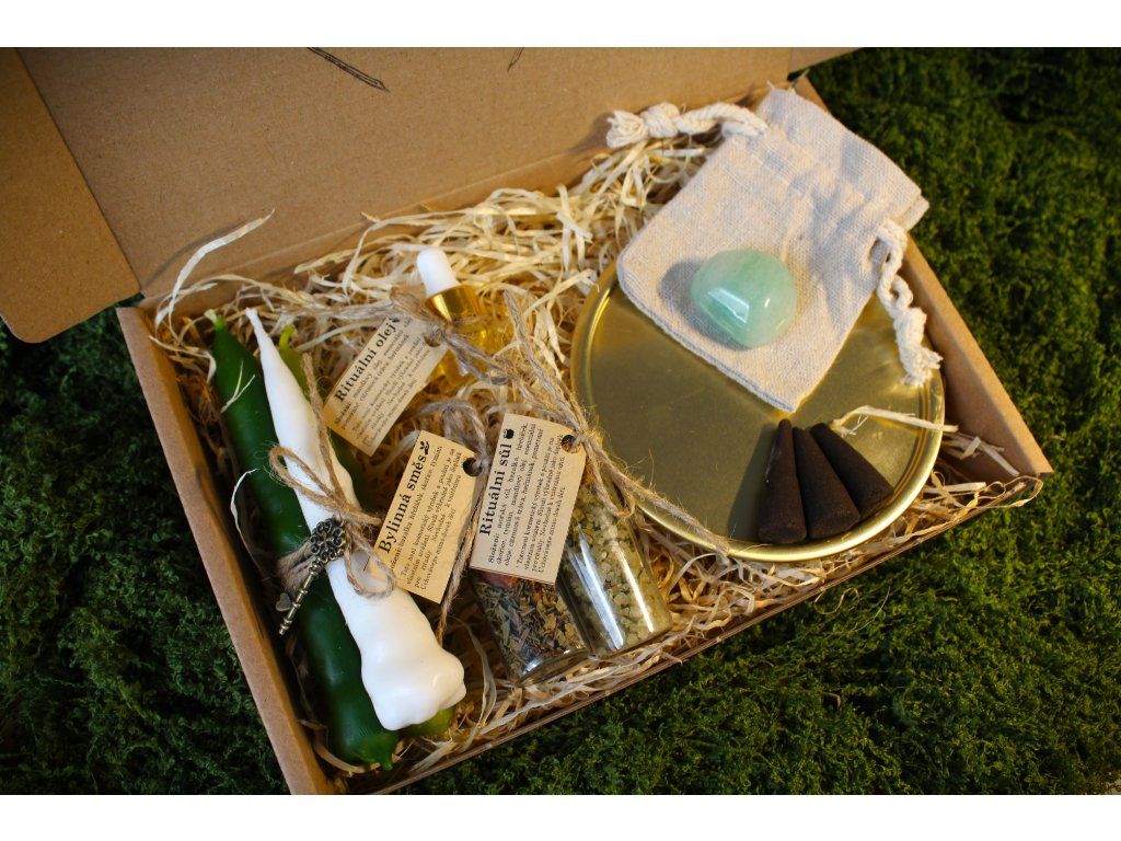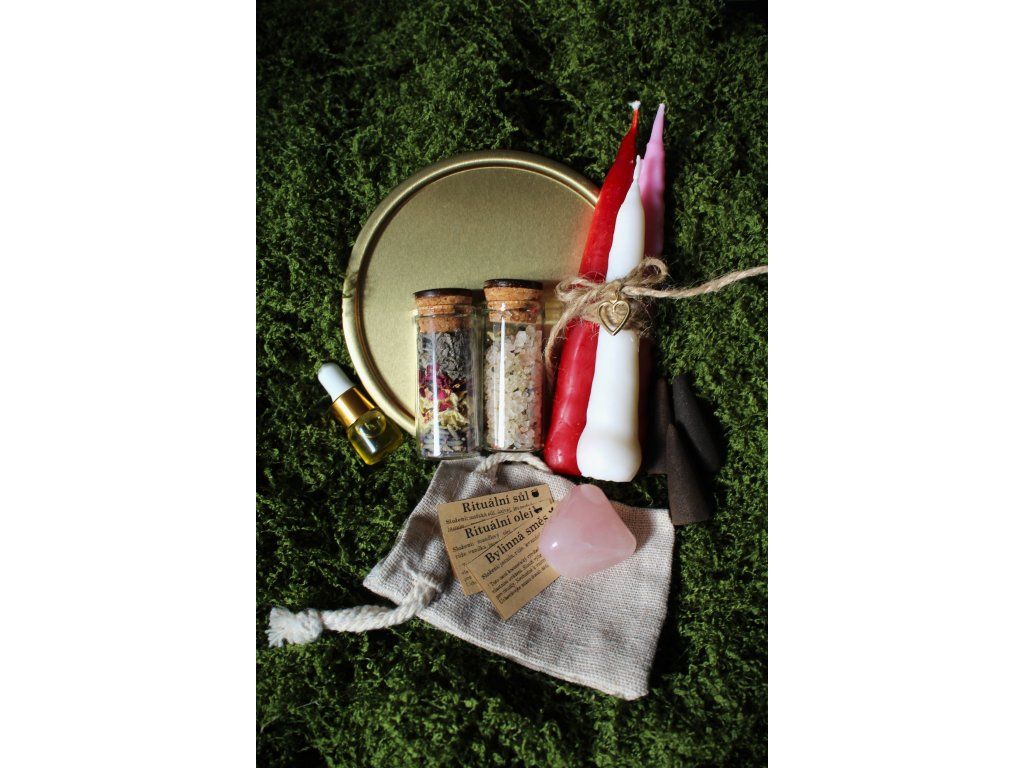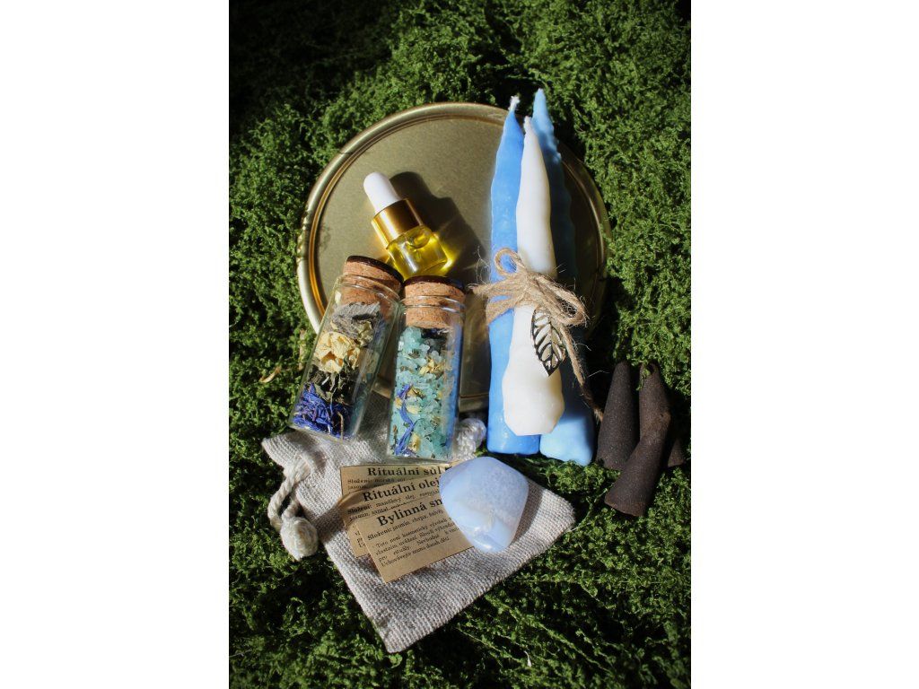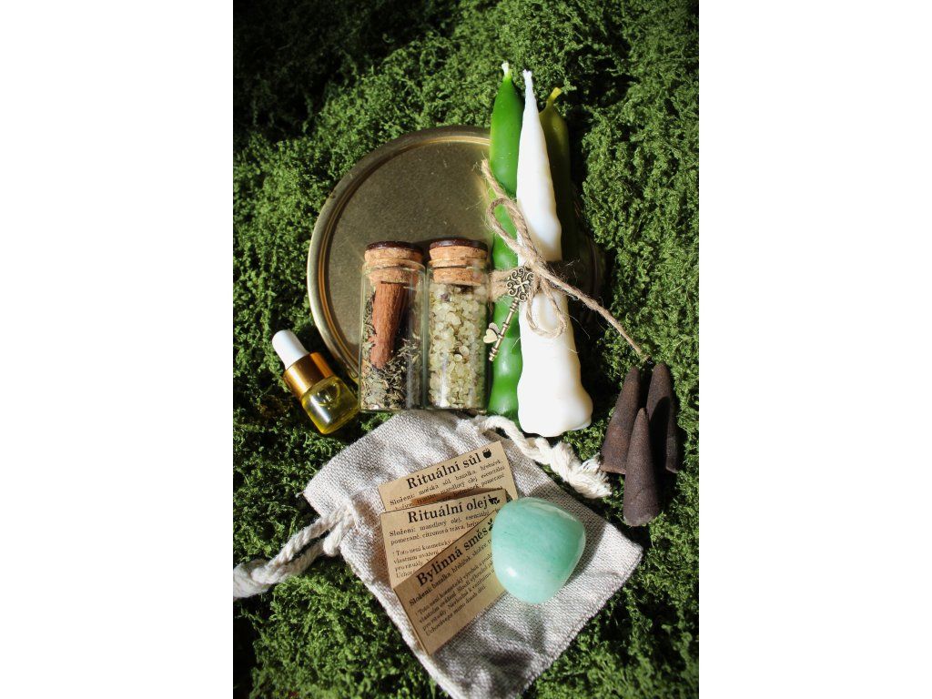 Sada obsahuje: 3ks máčených svíček s přívěskem, 3 vonné kužely, drahý kámen, jutový pytlík, podtácek, bylinnou směs, rituální sůl s bylinnou směsí a esenciálními oleji, kartičku s podrobným popisem a návodem rituálu